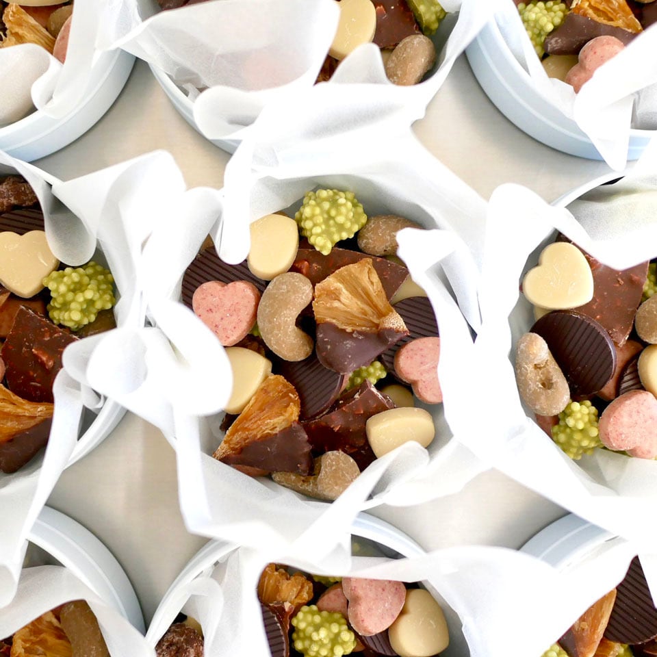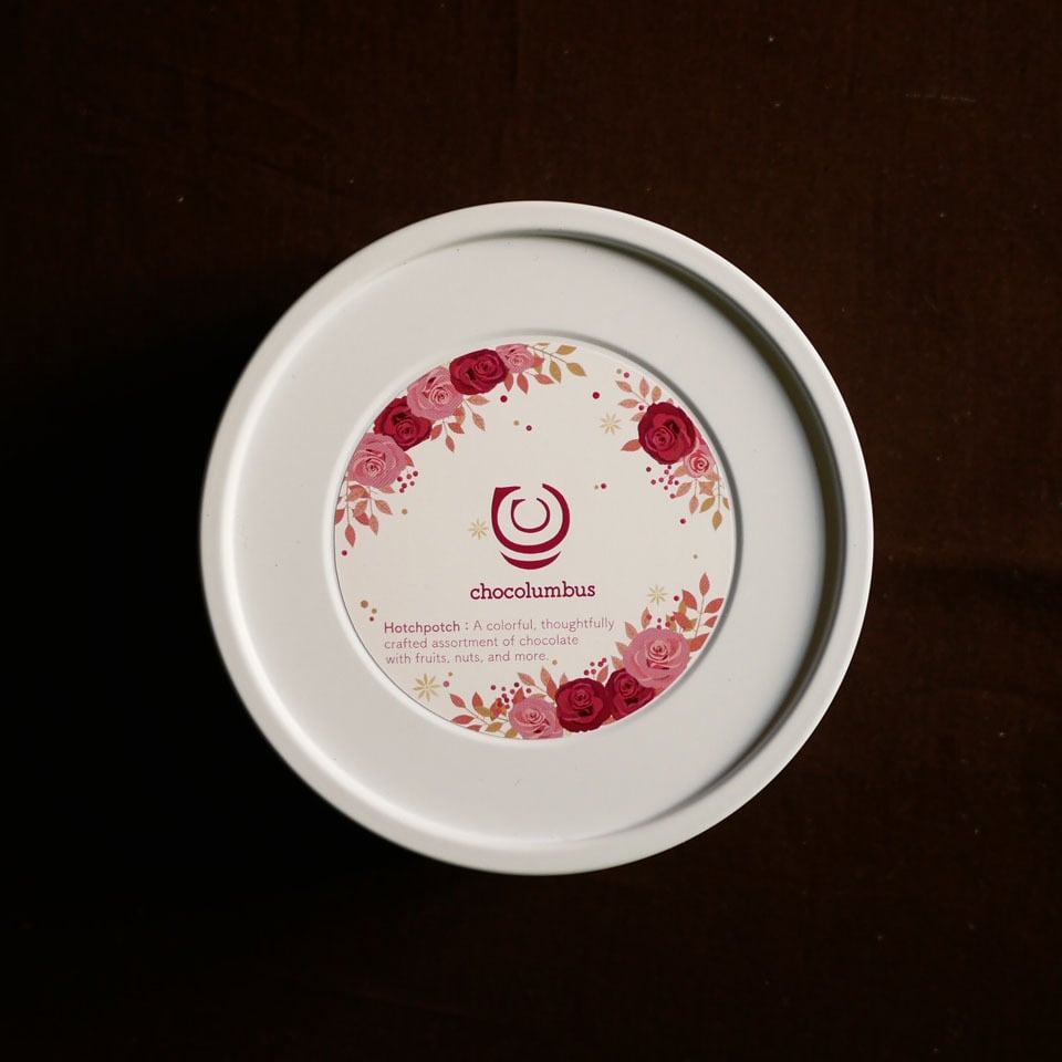 「ハッチポッチ」はまぜこぜの意。ダークチョコレート、ミルクチョコレート、ホワイトチョコレートの他、それぞれの自家製チョコレートとフルーツやナッツなど、多彩な素材を組み合わせた9種類が入っています。